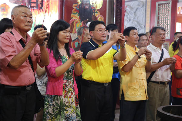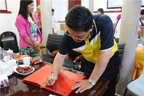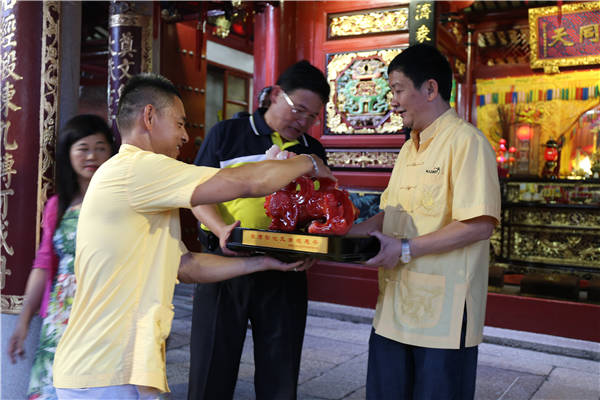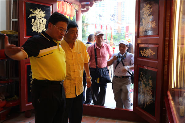 在一个多小时的访问过程中,邱建富先生在三王府内进香,详细参观了三王府内陈列的仿古王船模型,更加详细的了解了文兴宫三王府与台湾众多王爷庙宇的神缘、亲缘。而后,邱建富先生来到文兴宫帝君行宫,向保生大帝神尊进香,董事会相关负责人向邱先生介绍了帝君行宫和台湾台北保安宫间的神缘纽带和交流的历史,邱先生饶有兴致的听了介绍,频频点头,深深的感受到了闽台两岸间那种深厚的,永远无法割断的深厚情缘。