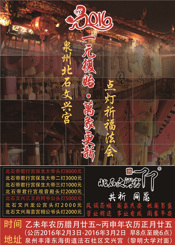 为弘扬正法,广利众生,本宫订于乙未年农历十二月廿五日(公历2016年2月3日星期三)举行“一元复始·万象更新”点灯祈福法会,为众善信祈福消灾,点亮新年的光明之灯。是日早九点由法师颂经祈福,伏望北石文兴宫列尊神明及诸天神降坛护佑众生,庇护善信大德阖家平安,万事如意,福星高照。