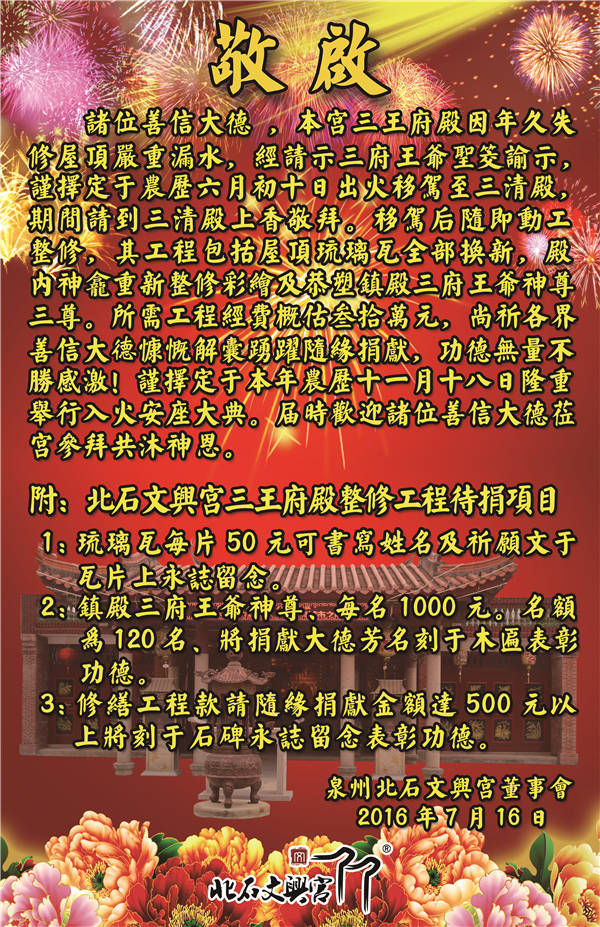 诸位善信大德 ,本宫三王府殿因年久失修屋顶严重漏水,经请示三府王爷圣筊谕示,谨择定于农历六月初十日出火移驾至三清殿,期间请到三清殿上香敬拜。移驾后随即动工整修,其工程包括屋顶琉璃瓦全部换新,殿内神龛重新整修彩绘及恭塑镇殿三府王爷神尊三尊。所需工程经费概估叁拾万元,尚祈各界善信大德慷慨解囊踊跃随缘捐献,功德无量不胜感激!