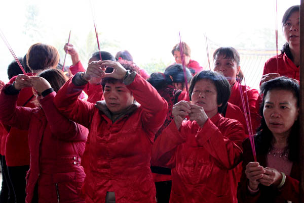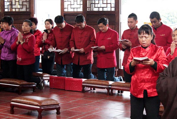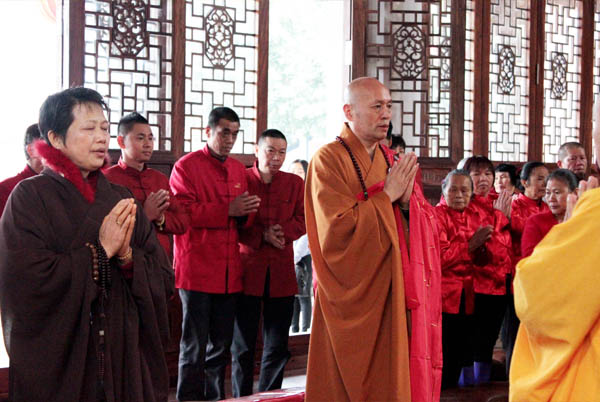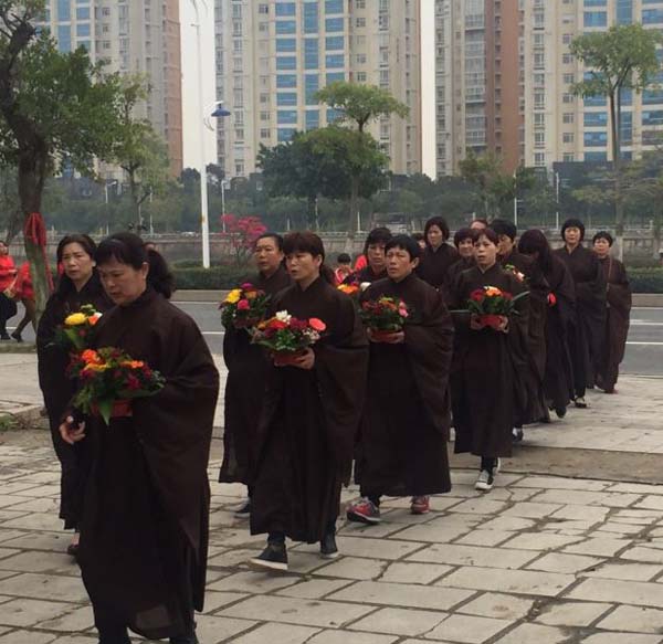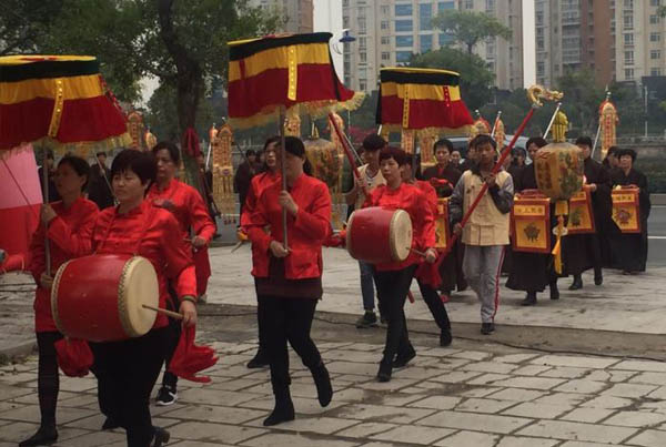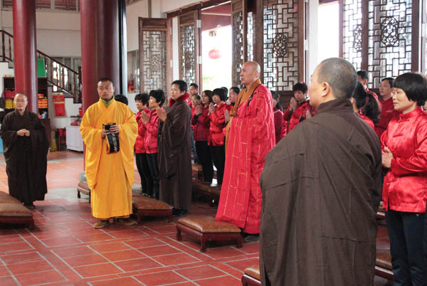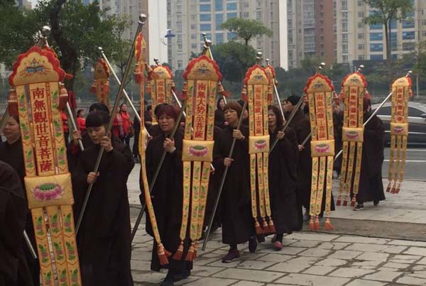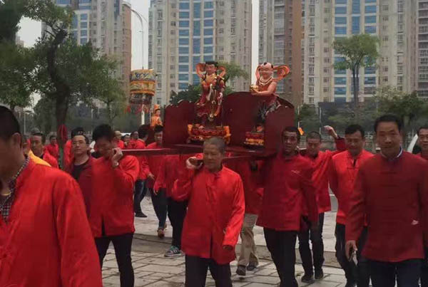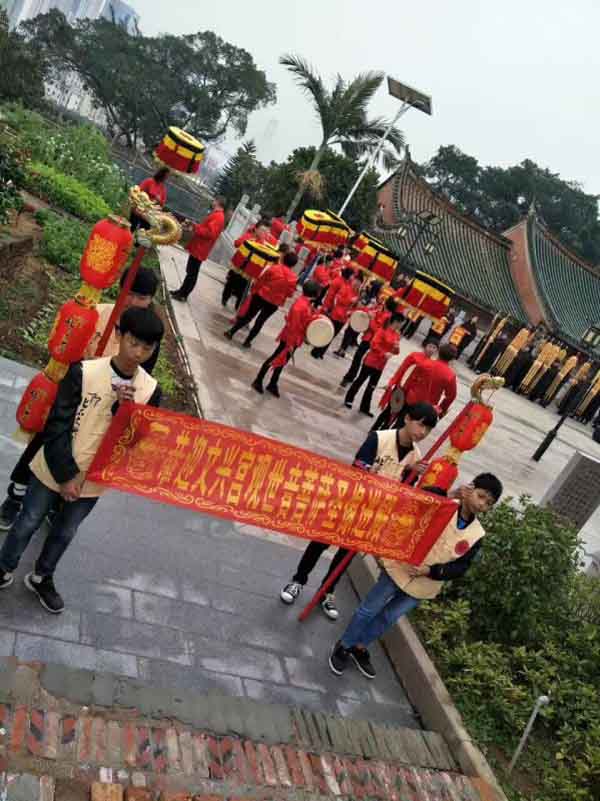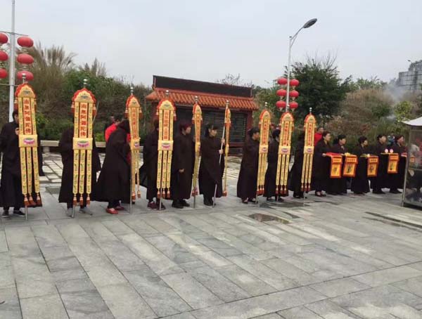 观世音圣像在2017年3月12日星期天,农历丁酉年二月十五日上午10点由青莲寺义工居士列队,幢幡、宝盖、香、花、灯、塗、果、十供养迎请回泉州文兴宫圆通宝殿,文兴宫诸善信统一着红衣出席,沿途信众均备办香案迎驾。