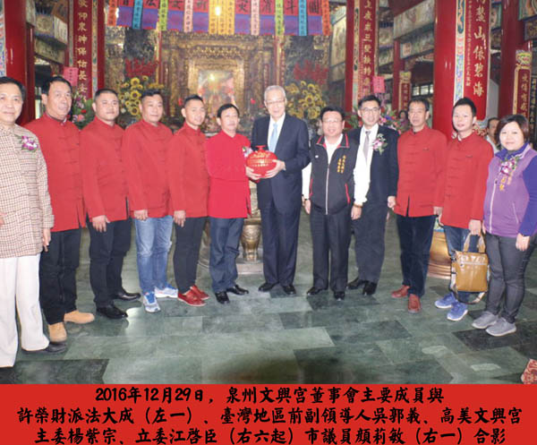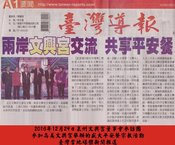2016年12月29日,泉州文兴宫组团赴台,参与分灵庙宇台中高美文兴宫盛大举办的平安餐宗教活动,全台各地的兄弟庙宇也群聚共襄盛举。