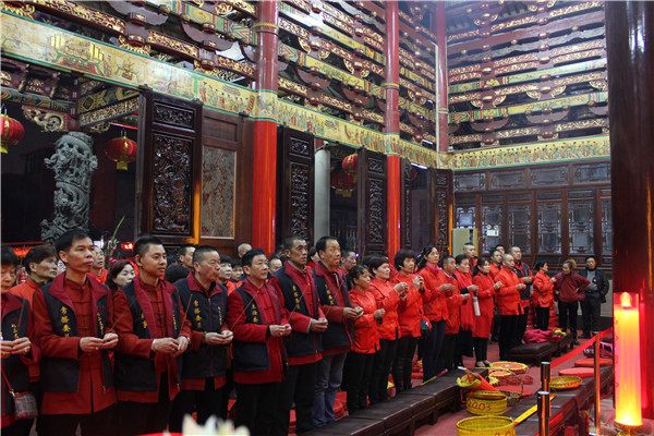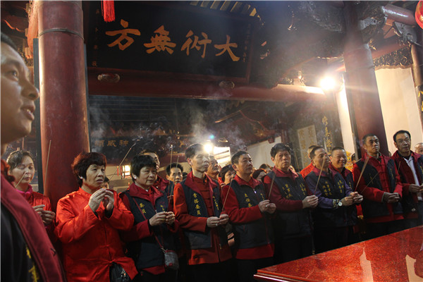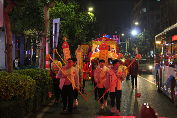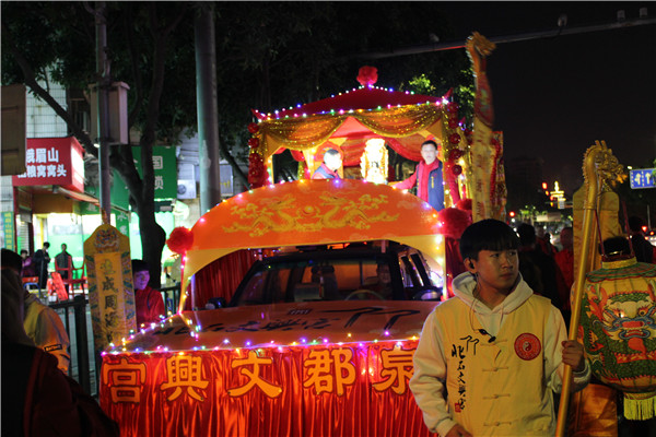 当晚,参加活动的善信们统一穿着红衣于当晚8点准时到文兴宫集合并随神明车架一同前往元妙观,参加人数众多,神威显赫,蔚为壮观。