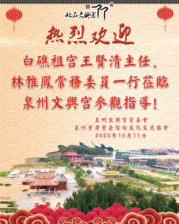 2020年10月11日,白礁慈济祖宫王贤清主任,林雅凤常务委员一行莅临泉州文兴宫参观指导。他们在泉州文兴宫管委会主要管理人员的陪同下一同拜谒了泉州文兴宫诸神明,并在会议室与泉州文兴宫的各位主委亲切交谈,交流心得。