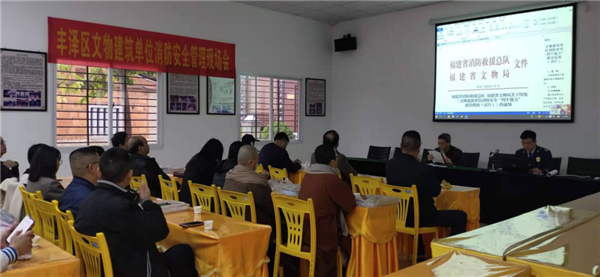 为进一步加强文物建筑消防安全工作,推进全区文物建筑消防安全能力建设,12月14日下午,区文体旅游局联合区消防救援大队在市级文物保护单位文兴宫召开丰泽区文物建筑消防安全管理现场会。区文体旅游局分管领导,区消防救援大队参谋,区文物保护中心全体工作人员,各街道文化站站长,全区16处文物建筑单位主要负责人约30人参加。