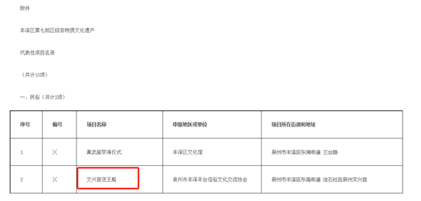日前,《泉州市丰泽区人民政府关于公布丰泽区第七批区级非物质文化遗产代表性项目名录的通知》发布。该批名录共有民俗、传统医药、传统技艺三个类别。其中,“文兴宫送王船”作为民俗类代表性项目入选。