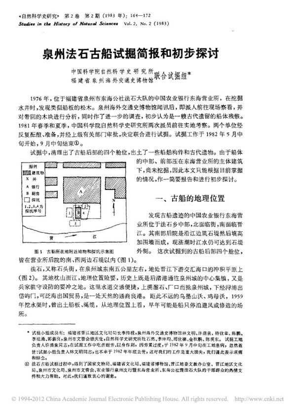 1976年,在位于当时泉州市东海公社法石大队的中国农业银行东海营业所的位置,因挖掘水井,无意间发现类似船板的松木。泉州海外交通史博物馆闻讯后,即派人前往现场查看,并对带回的木块进行分析,同时做了进一步的调查,初步认为是一艘古代遗留的船体残骸。1981年春季和夏季,中国科学院自然科学史研究所两次派员前往实地考察。两个单位经反复酝酿、准备,并经上级有关部门审批,决定联合进行试掘。试掘工作于1982年5月中旬开始,9月中旬结束。