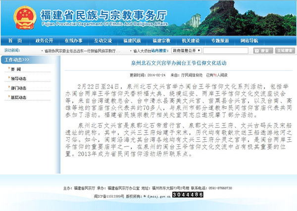 省民宗厅网站及《东南早报》报道闽台两岸王爷信仰文化交流