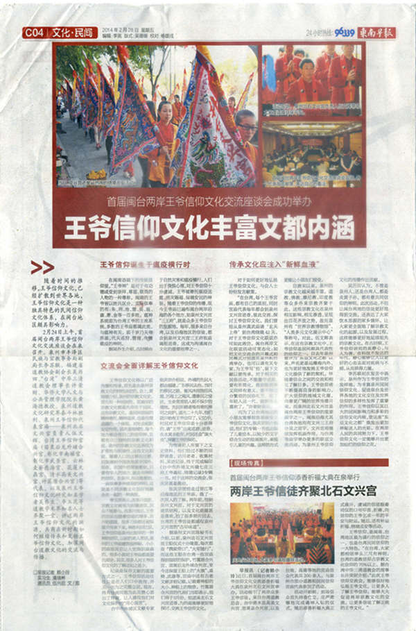 《东南早报》则在2月28日出版的”闽南周末“的C04版以《王爷信仰文化丰富文都内涵》为题整版报道了闽台两岸王爷信仰文化交流天香祈福大典及交流座谈会的盛况。
