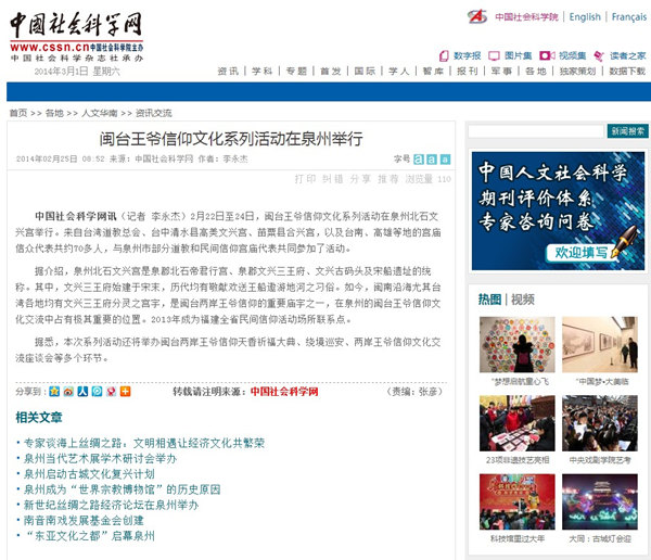 中国社会科学院网站中国社会科学网报道闽台两岸王爷信仰文化交流天香祈福大典盛况