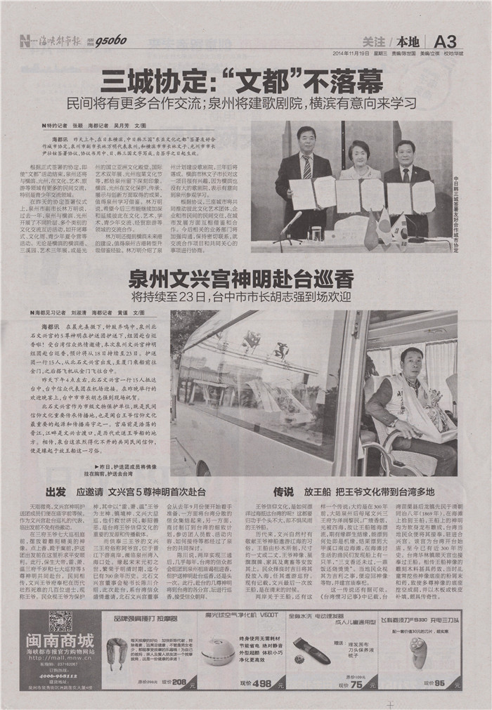 2014年11月18日,农历甲午年闰九月廿六日,由泉州北石文兴宫董事会董事长伍文辉先生带队的泉州北石文兴宫三府王爷七大巡赴台巡礼参访团正式启程前往台湾,展开为期六天的台湾参访巡礼之行。当日《海峡都市报》在A3版更是做了专题报道。